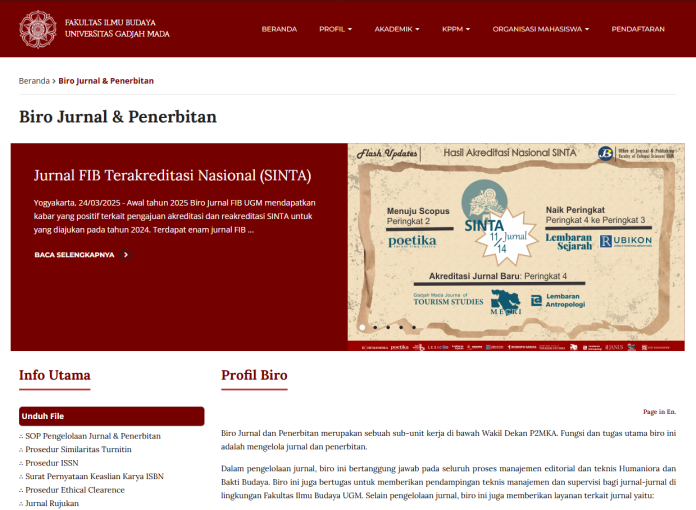 Keempat belas jurnal tersebut dapat diakses melalui laman Biro Jurnal & Penerbitan – FIB-UGM Melalui keempat belas jurnal tersebut, FIB UGM tidak hanya memberikan ruang bagi para peneliti untuk mempublikasikan hasil risetnya, tetapi juga membuka pintu bagi masyarakat luas untuk mendapatkan akses pengetahuan yang relevan dan terkini.