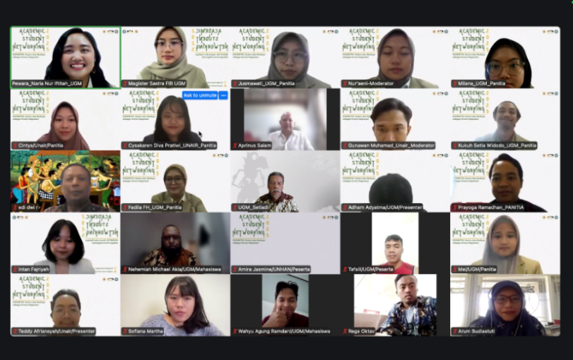 Yogyakarta, 1 Oktober 2025 — Program Studi Magister Sastra UGM sukses menyelenggarakan Seminar ASN (Academic Sharing Network) 2025 secara daring pada Selasa (1/10), pukul 08.00–15.00 WIB. Kegiatan yang mengangkat tema “Ekokritik: Sastra dan Budaya sebagai Arena Negosiasi” ini merupakan hasil kolaborasi antara Magister Sastra UGM dan Magister Kajian Sastra dan Budaya Universitas Airlangga. Kegiatan ini dihadiri oleh banyak mahasiswa dari kedua universitas.