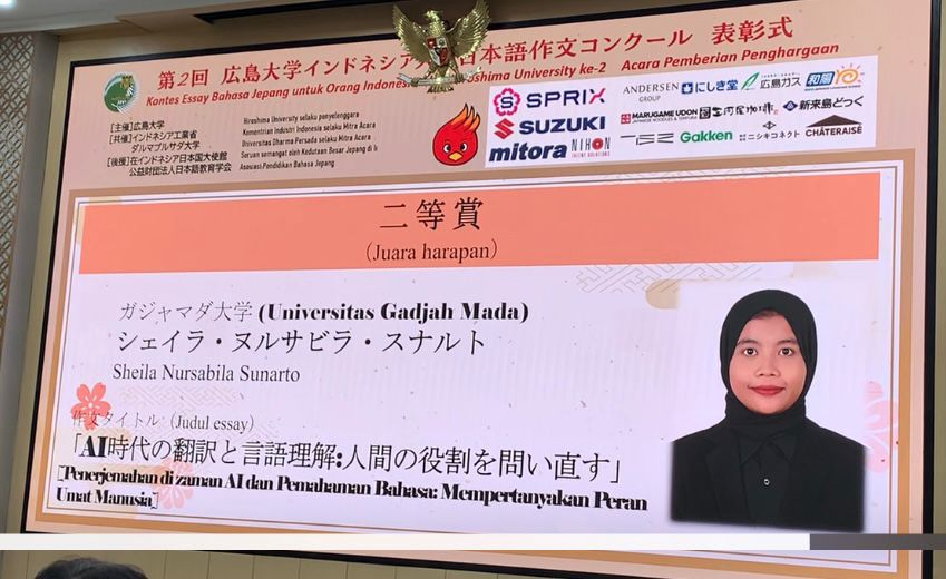 Program Studi Bahasa dan Kebudayaan Jepang Universitas Gadjah Mada (UGM) kembali menorehkan prestasi nasional dengan meraih Juara Umum Terbaik dalam 2nd Hiroshima University Japanese Essay Contest in Indonesia. Penghargaan tersebut diserahkan pada 7 Februari 2026 dalam acara penganugerahan yang berlangsung di Garuda Hall, Kementerian Perindustrian Republik Indonesia, Jakarta, dengan melibatkan berbagai institusi nasional dan internasional sebagai mitra penyelenggara.