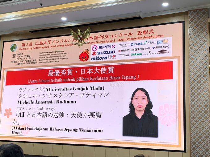 Mahasiswa Bahasa dan Kebudayaan Jepang UGM angkatan 2022, Michelle Anastasia Budiman, berhasil meraih Juara Umum Terbaik dan menerima hadiah utama berupa MacBook Air M4, tiket pulang-pergi Yogyakarta–Hiroshima beserta akomodasi selama dua minggu, tiket pulang-pergi Yogyakarta–Jakarta dan hotel untuk menghadiri acara penyerahan penghargaan, voucher makan Marugame Udon, serta sertifikat penghargaan.