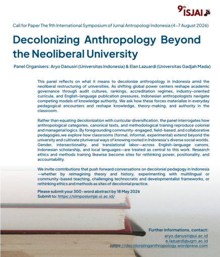 Kami mengundang akademisi, peneliti, dan praktis untuk berpartisipasi dalam diskusi mengenai masa depan disiplin ilmu antropologi pada Simposium Internasional ke-9 Jurnal Antropologi Indonesia (ISJAI) yang akan berlangsung pada 4–7 Agustus 2026. “Decolonizing Anthropology Beyond the Neoliberal University” adalah sebuah panel reflektif yang diusung oleh Aryo Danusiri dari Universitas Indonesia dan Elan Lazuardi dari Universitas Gadjah Mada, panel ini bertujuan untuk menjawab tantangan-tantangan paling mendesak dalam disiplin ilmu Antropologi saat ini.