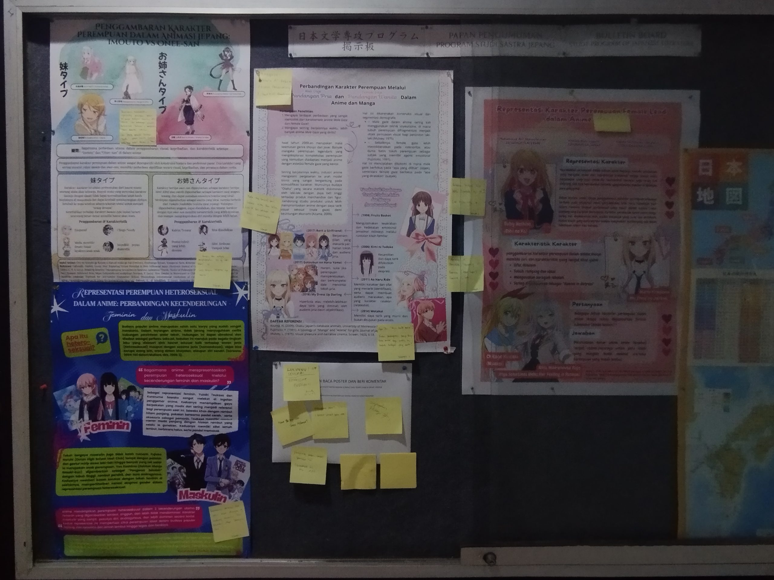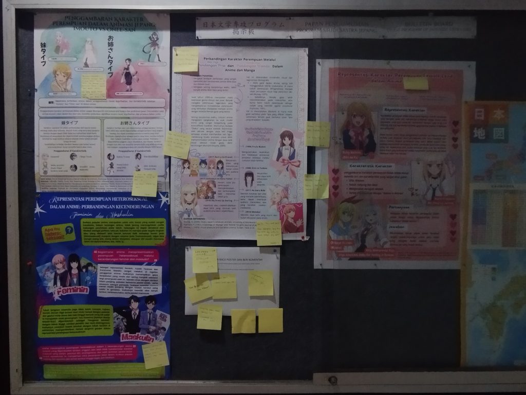 Poster yang disusun oleh setiap kelompok mengangkat tema representasi perempuan heteroseksual dalam media Jepang, dengan pendekatan visual dan analisis yang beragam. Setiap kelompok memaparkan isi posternya secara rinci dan menanggapi pertanyaan yang diajukan oleh mahasiswa tamu.