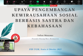Yogyakarta, 6 Oktober 2025 – Program Studi Sastra Arab, Fakultas Ilmu Budaya, Universitas Gadjah Mada kembali melanjutkan perkuliahan Kewirausahaan pada pertemuan keenam dengan kembali menghadirkan Sofian Munawar, S.S., M.A., Founder Ruang Baca Komunitas. Pada perkuliahan kali ini, mahasiswa diarahkan untuk menyusun business plan bertema “Upaya Pengembangan Kewirausahaan Sosial Berbasis Sastra dan Kebahasaan” sebagai bentuk penerapan nyata dari materi yang telah mereka pelajari di pertemuan sebelumnya.