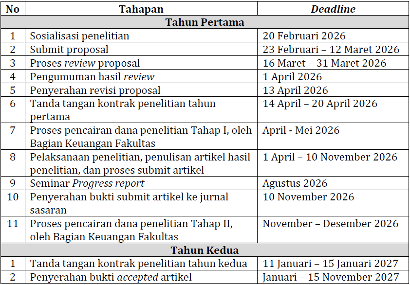 Sebagai bagian dari komitmen dalam mendorong pengembangan ilmu pengetahuan, inovasi akademik, serta penguatan jejaring riset, Fakultas Ilmu Budaya Universitas Gadjah Mada menyelenggarakan Skema Penelitian FIB UGM Tahun 2026. Program ini dirancang untuk memfasilitasi kegiatan penelitian yang berkualitas, kolaboratif, dan berorientasi pada kontribusi nyata bagi pengembangan keilmuan humaniora, budaya, bahasa, dan sastra, baik pada tingkat nasional maupun internasional.