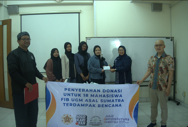 Yogyakarta, 8 Januari 2025 – Fakultas Ilmu Budaya (FIB) Universitas Gadjah Mada (UGM) bekerja sama dengan Masjid Jogokariyan untuk penyerahan donasi kepada 18 mahasiswa FIB UGM asal Sumatera yang terdampak bencana banjir. Penyerahan bantuan ini menjadi wujud kepedulian dan solidaritas berbagai elemen masyarakat terhadap mahasiswa yang terdampak langsung bencana alam.